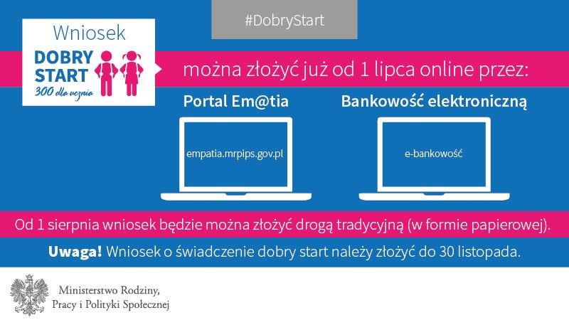 Wniosek – podobnie jak wnioski o świadczenie wychowawcze z programu „Rodzina 500+” – będzie można składać już od 1 lipca online przez stronę Ministerstwa Rodziny empatia.mrpips.gov.pl oraz przez bankowość elektroniczną, a od 1 sierpnia droga tradycyjną (papierową).