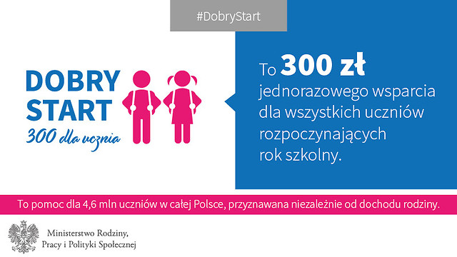 300 złotych – tyle wynosi świadczenie „Dobry Start” dla każdego uczącego się dziecka. Rząd ustanowił program, na podstawie, którego rodziny otrzymają raz w roku 300 zł na każde dziecko uczące się w szkole – bez względu na dochody. Po raz pierwszy świadczenie trafi do rodzin w tym roku. Wsparciem zostanie objętych 4,6 mln uczniów.
